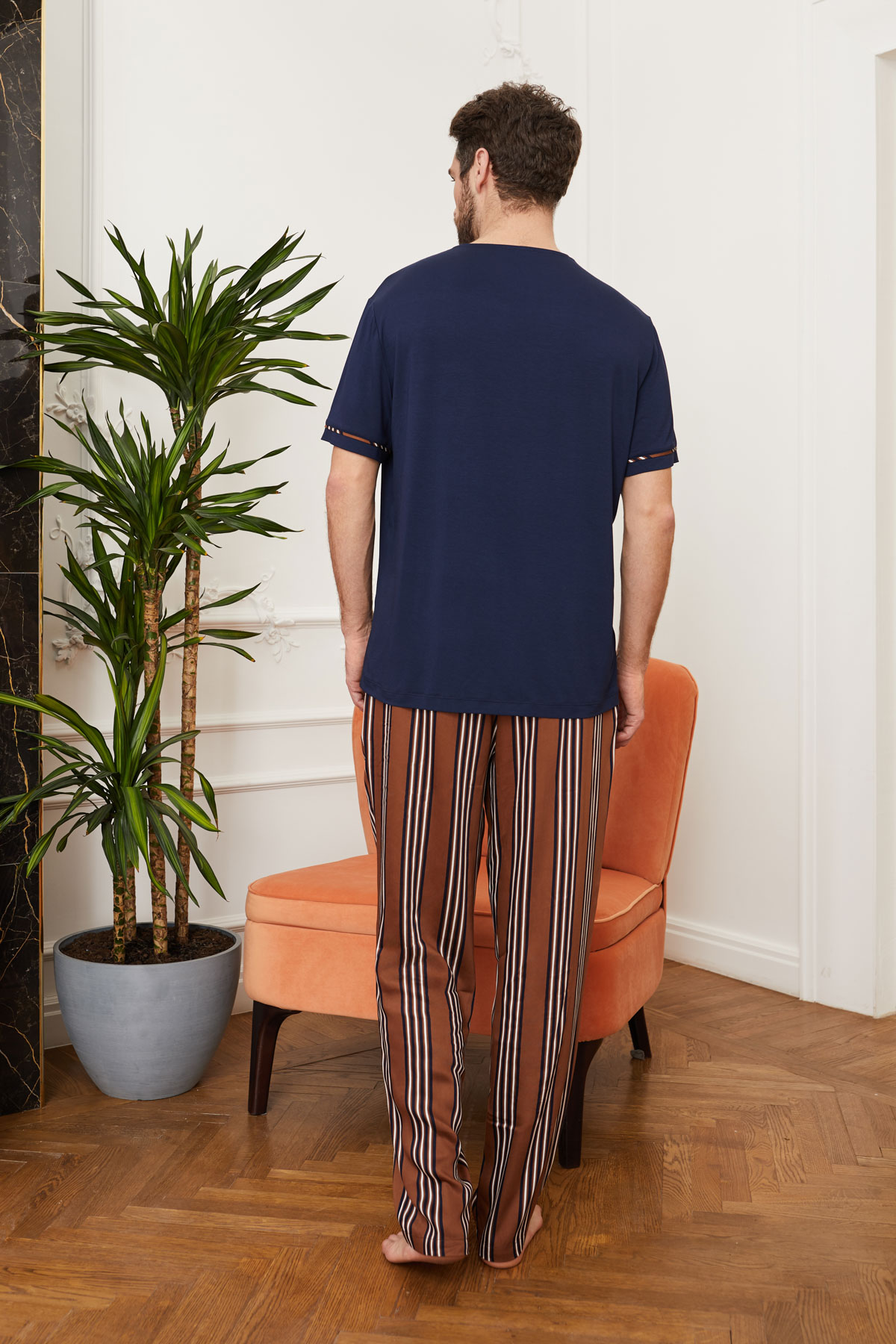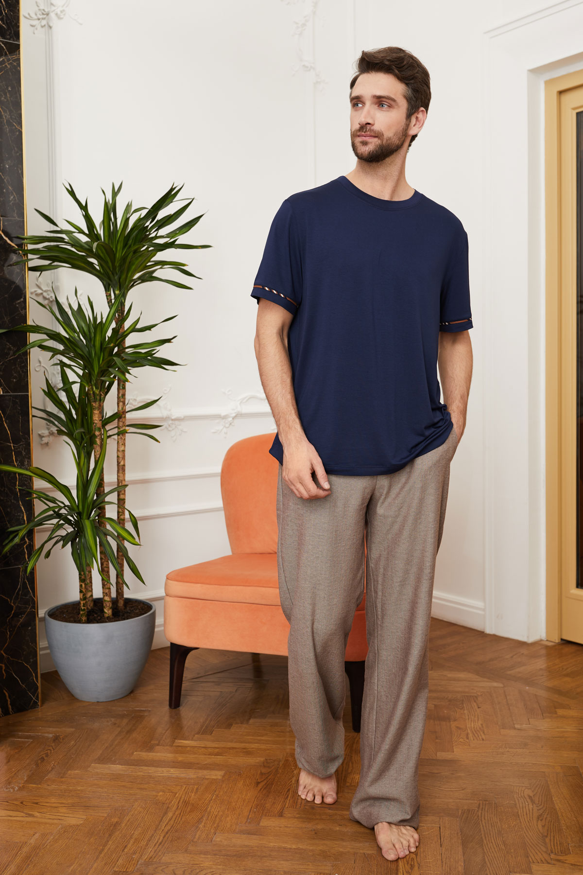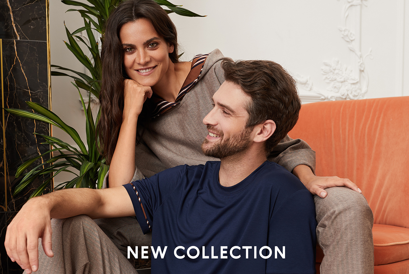 Белые цветы-лилии органично легли на ткани насыщенного темного и глубокого оттенка в моделях домашнего халата, рубашки и брюк
