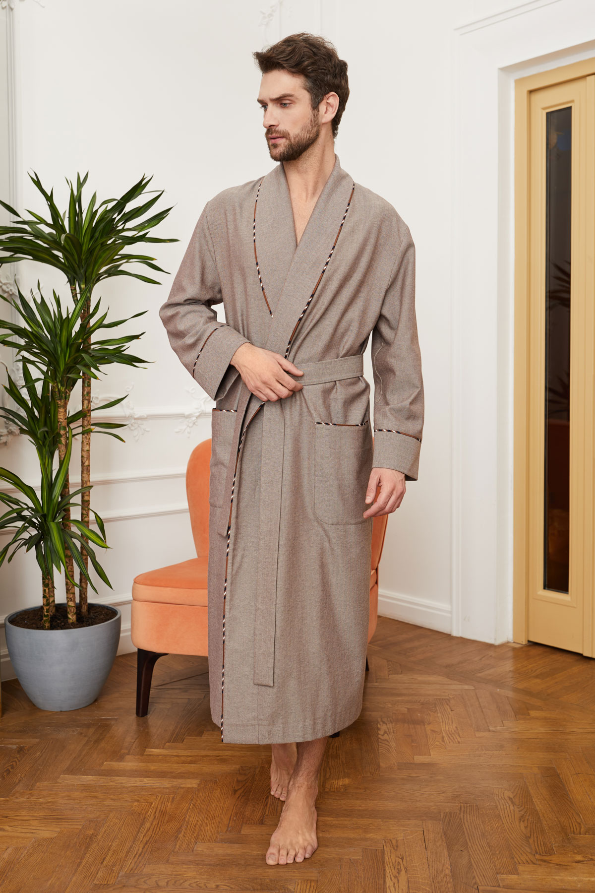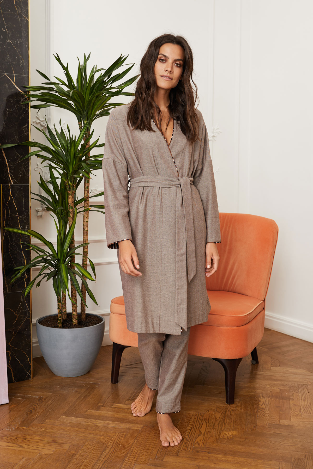 Модель уютного халата, нейтрального по цвету, который органично разбавит цветочный принт на брюках или полосатые шорты